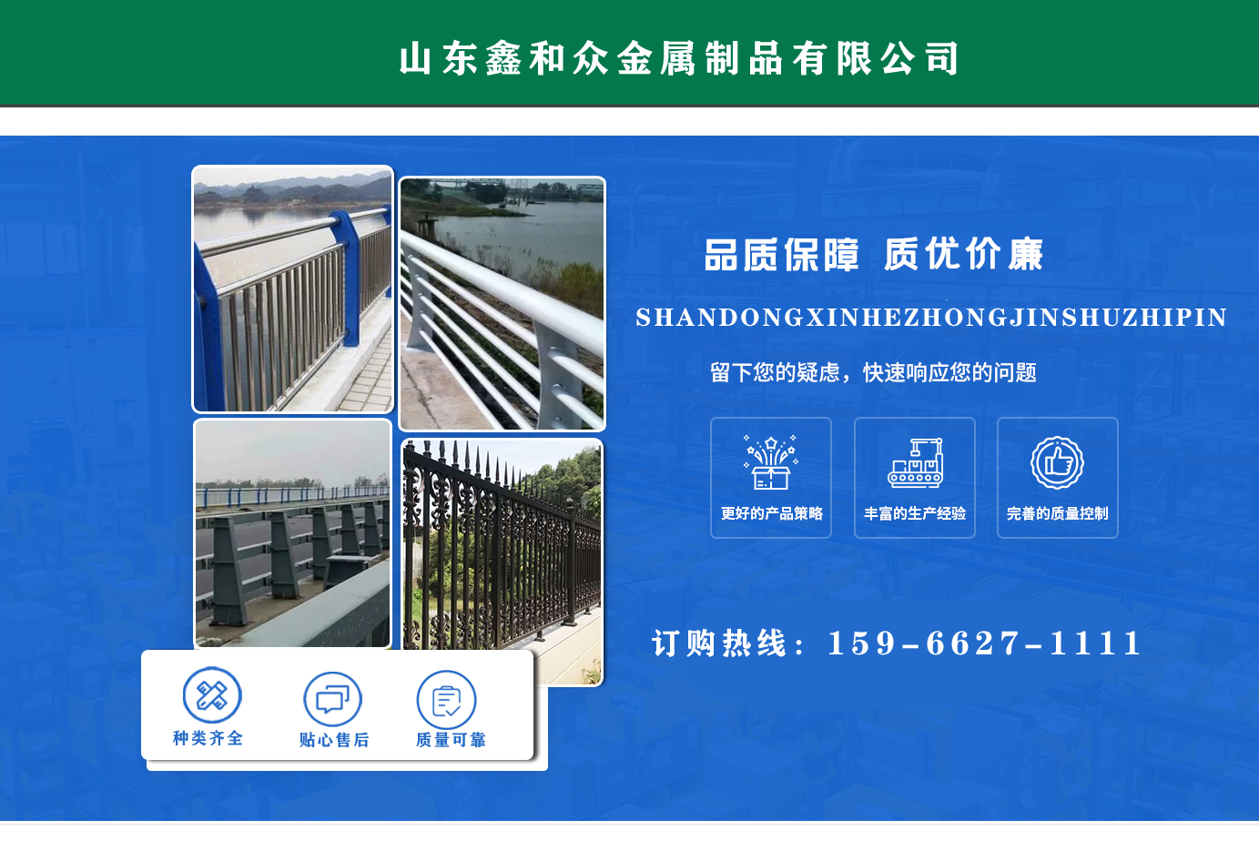 山東鑫和眾金屬制品有限公司主要產(chǎn)品有防撞護(hù)欄,橋梁護(hù)欄,道路護(hù)欄,河道護(hù)欄,不銹鋼護(hù)欄等護(hù)欄。提供設(shè)計方案,一站式定制,包您滿意價格優(yōu)惠,歡迎來電咨詢! 公司常年從事銷售護(hù)欄防撞護(hù)欄,橋梁護(hù)欄,道路護(hù)欄,河道護(hù)欄,不銹鋼護(hù)欄,橋梁鋼護(hù)欄,河道燈光護(hù)欄等。產(chǎn)品廣泛應(yīng)用于橋梁、河道、旅游景區(qū)、道路、公路、公園、小區(qū)、景觀、道路防撞等領(lǐng)域。 公司產(chǎn)品均采用優(yōu)質(zhì)不銹鋼材料,符合相關(guān)標(biāo)準(zhǔn)。各種型號不銹鋼復(fù)合管及護(hù)欄,質(zhì)量嚴(yán)格把控。產(chǎn)品強(qiáng)度高、耐腐蝕、焊接牢固、抗沖擊、性能好,防撞護(hù)欄結(jié)構(gòu)簡單、美觀實用大方。 歡迎前來訂購!...
